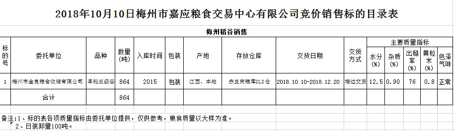 受客戶委托,梅州市嘉應(yīng)糧食交易中心有限公司定于2018年10月10日(星期三)舉辦糧食競(jìng)價(jià)交易會(huì),梅州市金良糧食收儲(chǔ)有限公司擬銷售2015年早秈稻864噸。