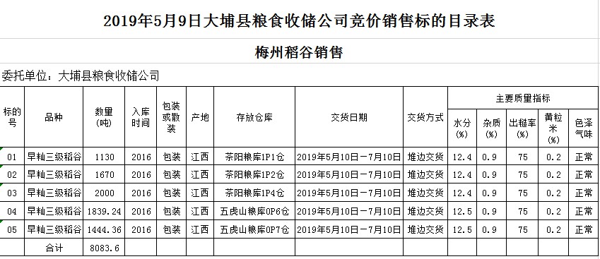 受客戶委托,梅州市嘉應(yīng)糧食交易中心有限公司定于2019年5月9日(星期四)舉辦糧食競價交易會,大埔縣糧食收儲公司擬銷售2016年早秈稻8083.6噸。