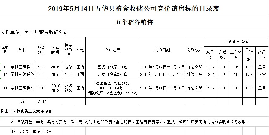 受客戶委托,梅州市嘉應(yīng)糧食交易中心有限公司定于2019年5月14日(星期二)舉辦糧食競(jìng)價(jià)交易會(huì),五華縣糧食收儲(chǔ)公司擬銷(xiāo)售2016年早秈稻13169.1305噸,2018年早秈稻0.8695噸。