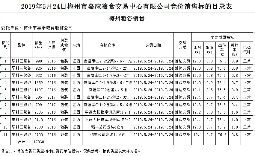 交易時間和地點:2019年5月24日(星期五)上午10時20分。廣東省梅州市彬芳大道南161號梅州市糧食交易中心3樓。