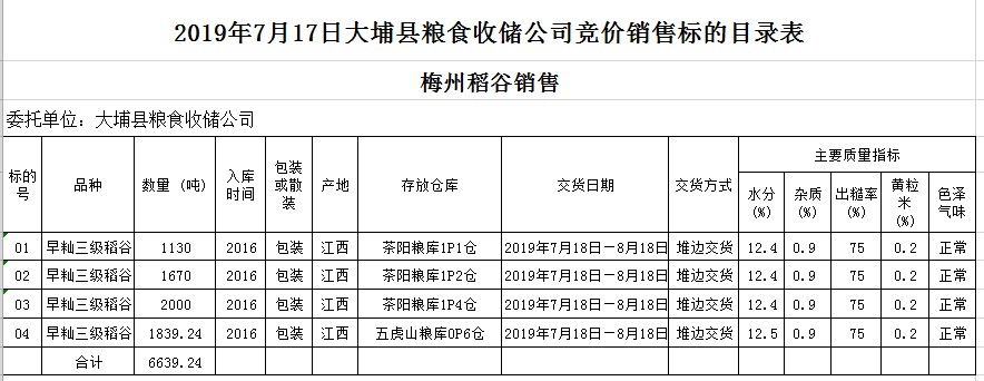 受客戶委托,梅州市嘉應(yīng)糧食交易中心有限公司定于2019年7月17日(星期三)舉辦糧食競價交易會,大埔縣糧食收儲公司擬銷售2016年早秈稻6639.24噸。