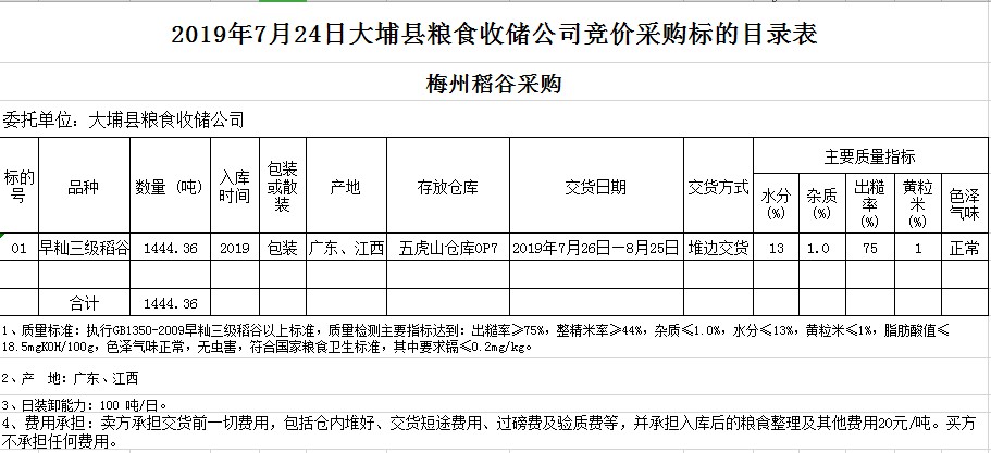 受客戶委托,梅州市嘉應糧食交易中心有限公司定于2019年7月24日(星期三)舉辦糧食競價交易會,大埔縣糧食收儲公司擬采購2019年早秈稻1444.36噸。