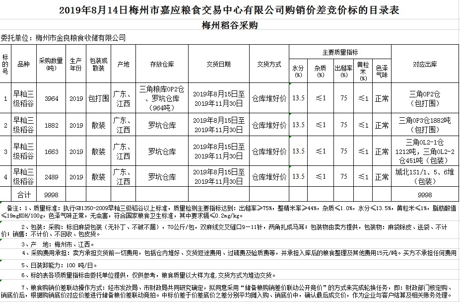 受客戶委托,梅州市嘉應(yīng)糧食交易中心有限公司定于2019年8月14日(星期三)舉辦稻谷購銷價(jià)差聯(lián)動(dòng)標(biāo)的交易會(huì),梅州市金良糧食收儲(chǔ)有限公司擬銷售和采購早秈稻9998噸。
