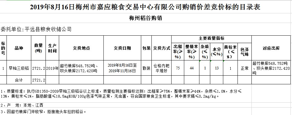 受客戶委托,梅州市嘉應(yīng)糧食交易中心有限公司定于2019年8月16日(星期五)舉辦稻谷購銷價(jià)差聯(lián)動(dòng)標(biāo)的交易會(huì),平遠(yuǎn)縣糧食收儲(chǔ)公司擬銷售和采購早秈稻2721.2噸。