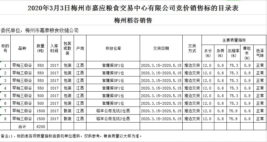 受客戶委托,梅州市嘉應(yīng)糧食交易中心有限公司定于2020年3月3日(星期二)舉辦糧食競價(jià)交易會(huì),梅州市嘉泰糧食收儲(chǔ)公司擬銷售2017年早秈稻6200噸。