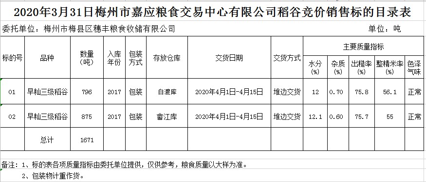 受客戶委托,梅州市嘉應(yīng)糧食交易中心有限公司定于2020年3月31日(星期二)舉辦糧食競(jìng)價(jià)交易會(huì),梅州市梅縣區(qū)穗豐糧食收儲(chǔ)有限公司擬銷售2017年早秈稻1671噸。