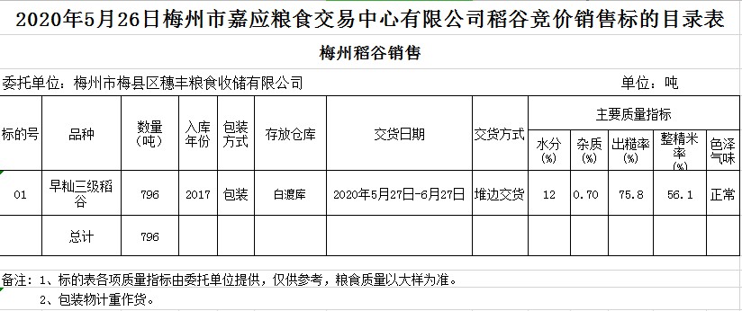 受客戶委托,梅州市嘉應(yīng)糧食交易中心有限公司定于2020年5月26日(星期二)舉辦糧食競價交易會,梅州市梅縣區(qū)穗豐糧食收儲有限公司擬銷售2017年早秈稻796噸。