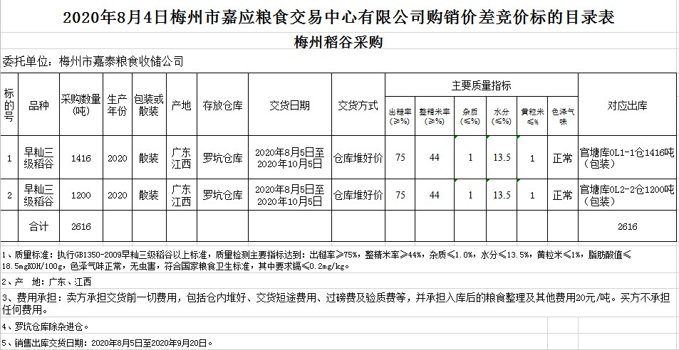 受客戶(hù)委托,梅州市嘉應(yīng)糧食交易中心有限公司定于2020年8月4日(星期二)舉辦稻谷購(gòu)銷(xiāo)價(jià)差聯(lián)動(dòng)標(biāo)的交易會(huì),梅州市嘉泰糧食收儲(chǔ)公司擬銷(xiāo)售和采購(gòu)早秈稻2616噸。