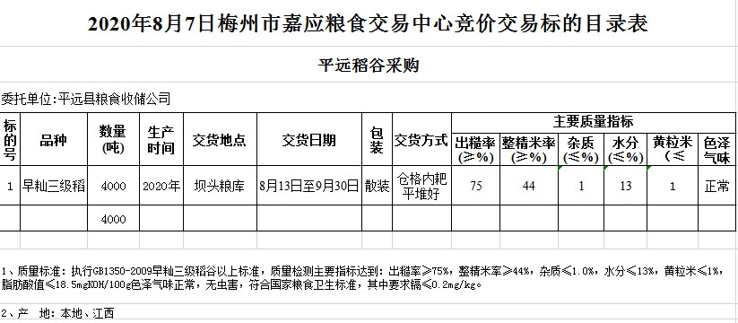 受客戶委托,梅州市嘉應(yīng)糧食交易中心有限公司定于2020年8月7日(星期五)舉辦糧食競(jìng)價(jià)交易會(huì),平遠(yuǎn)縣糧食收儲(chǔ)公司擬采購2020年早秈稻4000噸。