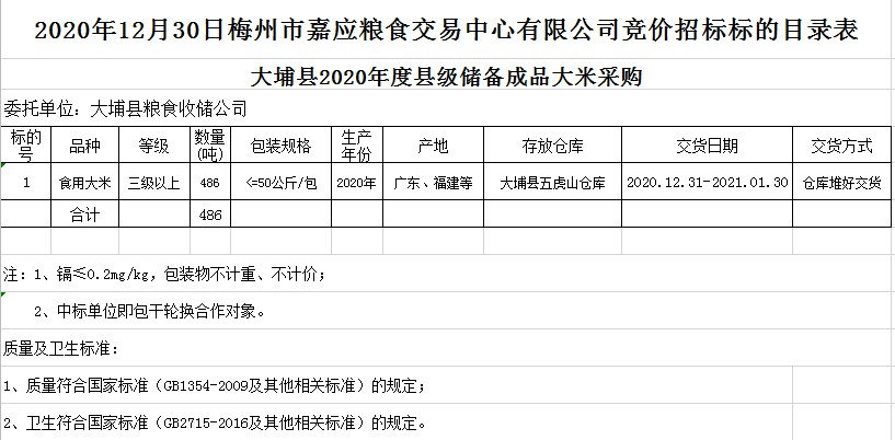 受客戶委托,梅州市嘉應(yīng)糧食交易中心有限公司定于2020年12月30日(星期三)上午10時在廣東省梅州市彬芳大道南161號梅州市糧食交易中心3樓,舉辦大埔縣縣級儲備成品糧采購公開招標。