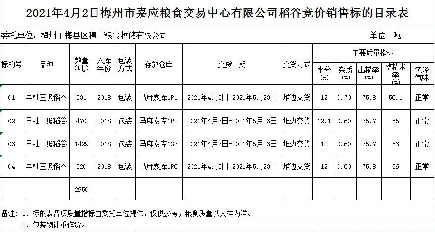 受客戶委托,梅州市嘉應(yīng)糧食交易中心有限公司定于2021年4月2日(星期五)舉辦糧食競價(jià)交易會(huì)。梅州市梅縣區(qū)穗豐糧食收儲有限公司擬銷售2018年早秈稻2950噸。