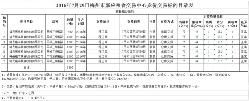 受客戶委托,梅州市嘉應糧食交易中心有限公司定于2016年7月29日舉辦糧食競價交易會,梅州市梅縣區(qū)穗豐糧食收儲有限公司擬采購2016年產早秈三級稻谷6892噸。