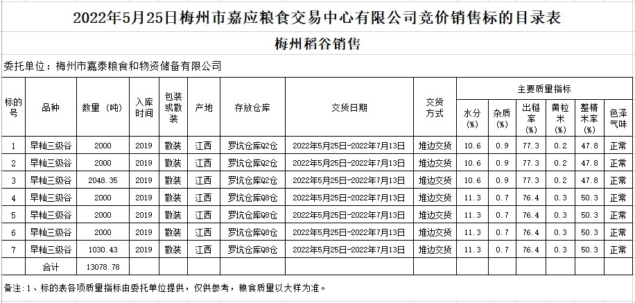 受客戶委托,梅州市嘉應糧食交易中心有限公司定于2022年5月25日(星期三)舉辦糧食競價交易會。梅州市嘉泰糧食和物資儲備有限公司擬銷售2019年早秈稻13078.78噸。