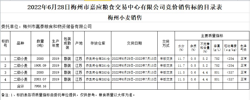 受客戶委托,梅州市嘉應(yīng)糧食交易中心有限公司定于2022年6月28日(星期二)舉辦糧食競(jìng)價(jià)交易會(huì)。梅州市嘉泰糧食和物資儲(chǔ)備有限公司擬銷售2019年小麥7958.16噸。