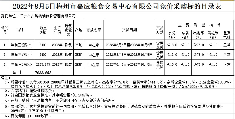 受客戶委托,梅州市嘉應糧食交易中心有限公司定于2022年8月5日(星期五)舉辦糧食競價交易會。興寧市齊昌糧油儲備管理有限公司擬采購2022年早秈稻7033.693噸。