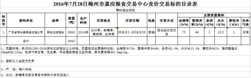 受客戶委托,梅州市嘉應(yīng)糧食交易中心有限公司定于2016年7月28日舉辦糧食競(jìng)價(jià)交易會(huì),廣東省蕉嶺縣糧食收儲(chǔ)公司擬采購(gòu)2016年產(chǎn)早秈三級(jí)稻谷5063噸。