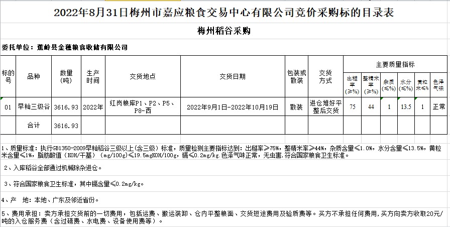 受客戶委托,梅州市嘉應(yīng)糧食交易中心有限公司定于2022年8月31日(星期三)舉辦糧食競(jìng)價(jià)交易會(huì)。蕉嶺縣金穗糧食收儲(chǔ)有限公司擬采購2022年早秈稻3616.93噸。