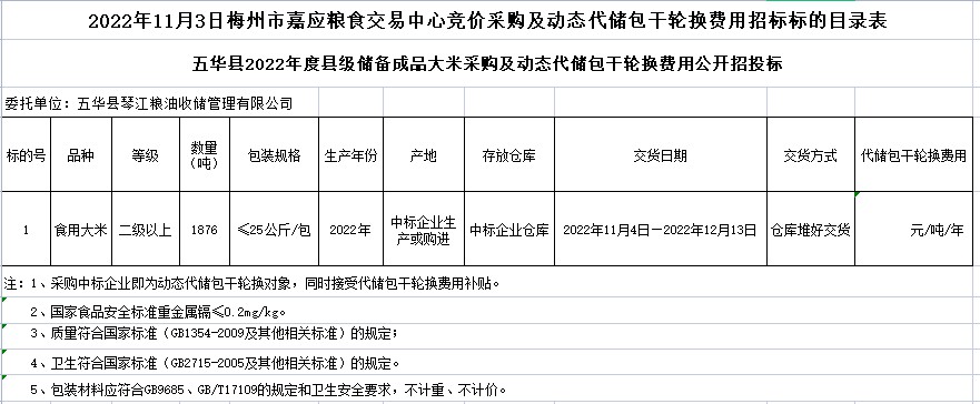 五華縣2022年縣級成品糧采購及動態(tài)代儲包干輪換費用公開招標公告