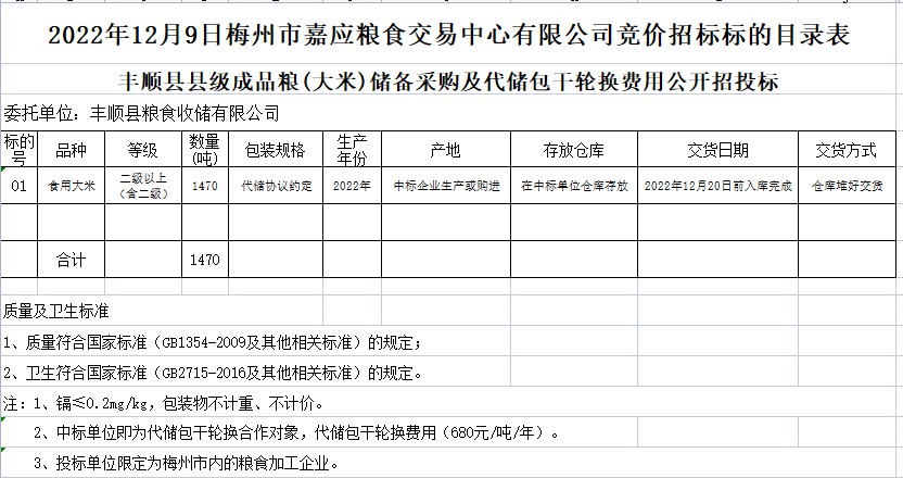 受客戶委托,梅州市嘉應(yīng)糧食交易中心有限公司定于2022年12月9日(星期五)上午10時在廣東省梅州市彬芳大道南161號梅州市糧食交易中心3樓,舉辦豐順縣縣級動態(tài)儲備成品糧(食用大米)采購公開招標(biāo)。