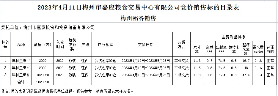 受客戶委托,梅州市嘉應(yīng)糧食交易中心有限公司定于2023年4月11日(星期二)舉辦糧食競價交易會。梅州市嘉泰糧食和物資儲備有限公司擬銷售2020年早秈稻5820.58噸。