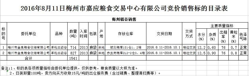 受客戶委托,梅州市嘉應(yīng)糧食交易中心有限公司定于2016年8月11日舉辦糧食競價(jià)交易會,梅州市金良糧食收儲有限公司擬銷售2013年產(chǎn)早秈三級稻谷1541噸。