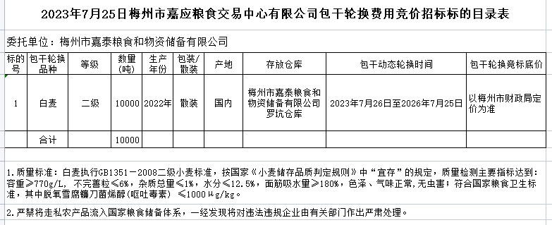 受客戶委托,梅州市嘉應糧食交易中心有限公司定于2023年7月25日(星期二)上午10時30分在梅州市嘉應糧食交易中心有限公司舉辦梅州市市級儲備糧小麥包干輪換(自主輪換)公開招標。
