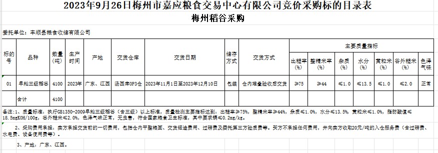 受客戶委托,梅州市嘉應(yīng)糧食交易中心有限公司定于2023年9月26日(星期二)舉辦糧食競價交易會。豐順縣糧食收儲有限公司擬采購2023年早秈稻谷4100噸。