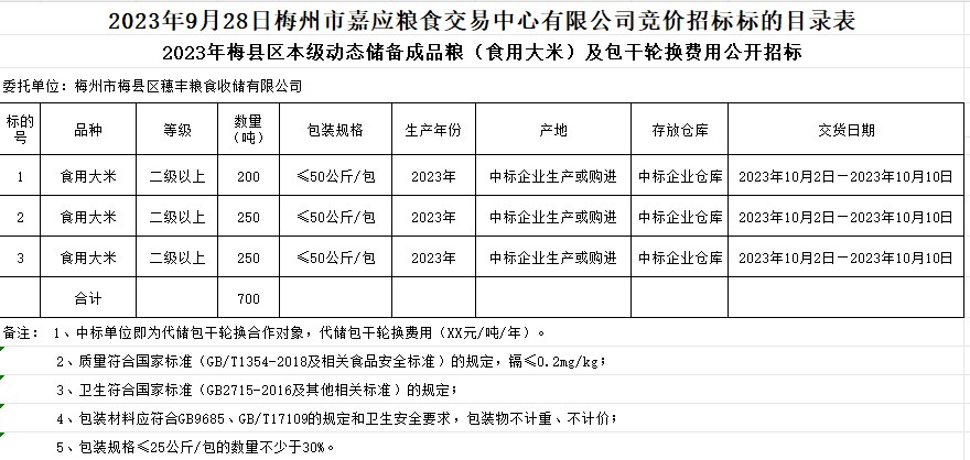 梅縣區(qū)2023年本級(jí)動(dòng)態(tài)儲(chǔ)備成品糧采購及包干輪換費(fèi)用公開招投標(biāo)公告