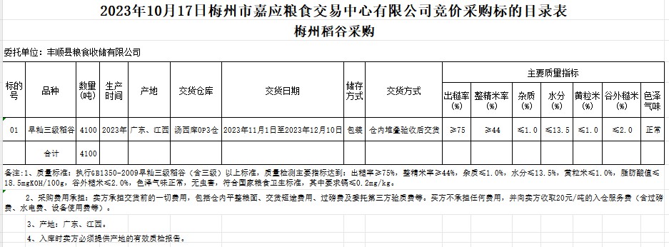 受客戶委托,梅州市嘉應(yīng)糧食交易中心有限公司定于2023年10月17日(星期二)舉辦糧食競價交易會。豐順縣糧食收儲有限公司擬采購2023年早秈稻谷4100噸。