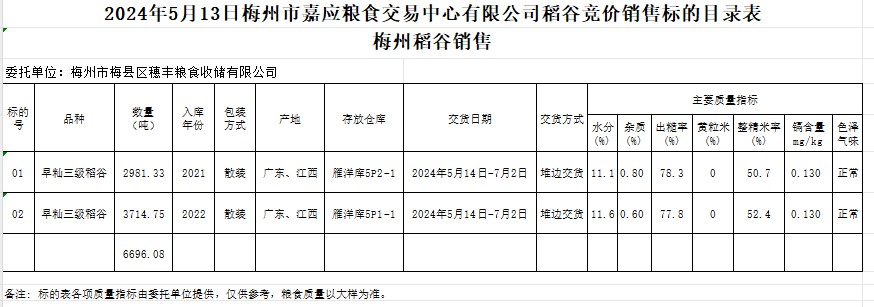 受客戶委托,梅州市嘉應(yīng)糧食交易中心有限公司定于2024年5月13日(星期一)舉辦糧食競價交易會。梅州市梅縣區(qū)穗豐糧食收儲有限公司擬銷售2021年、2022年產(chǎn)早秈稻6696.08噸。