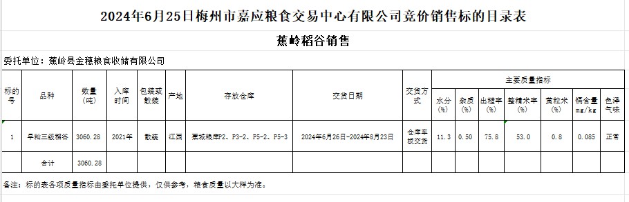 受客戶委托,梅州市嘉應(yīng)糧食交易中心有限公司定于2024年6月25日(星期二)舉辦糧食競價交易會。蕉嶺縣金穗糧食收儲有限公司擬銷售2021年產(chǎn)早秈稻谷3060.28噸。