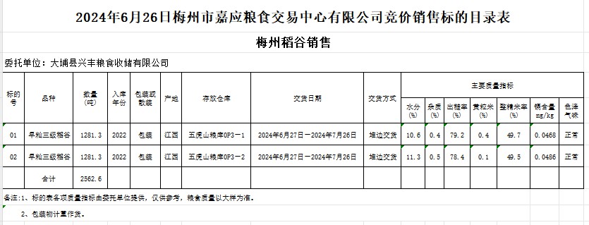 受客戶委托,梅州市嘉應(yīng)糧食交易中心有限公司定于2024年6月26日(星期三)舉辦糧食競(jìng)價(jià)交易會(huì)。大埔縣興豐糧食收儲(chǔ)有限公司擬銷售2022年產(chǎn)早秈稻谷2562.6噸。