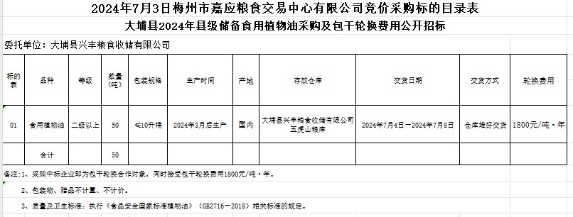 受大埔縣興豐糧食收儲(chǔ)有限公司委托,梅州市嘉應(yīng)糧食交易中心有限公司定于2024年7月3日(星期三)上午10時(shí)在廣東省梅州市彬芳大道南161號(hào)梅州市糧食交易中心3樓,舉辦大埔縣2024年縣級(jí)儲(chǔ)備食用植物油采購(gòu)及包干輪換費(fèi)用公開招標(biāo)。