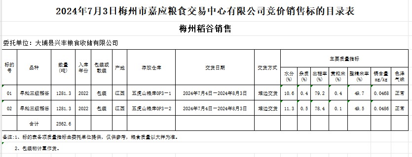 受客戶委托,梅州市嘉應(yīng)糧食交易中心有限公司定于2024年7月3日(星期三)舉辦糧食競(jìng)價(jià)交易會(huì)。大埔縣興豐糧食收儲(chǔ)有限公司擬銷(xiāo)售2022年產(chǎn)早秈稻谷2562.6噸。