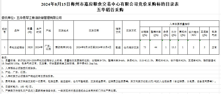 受客戶委托,梅州市嘉應(yīng)糧食交易中心有限公司定于2024年8月15日(星期四)舉辦糧食競(jìng)價(jià)交易會(huì)。五華縣琴江糧油收儲(chǔ)管理有限公司擬采購(gòu)2024年產(chǎn)早秈稻谷3820噸。