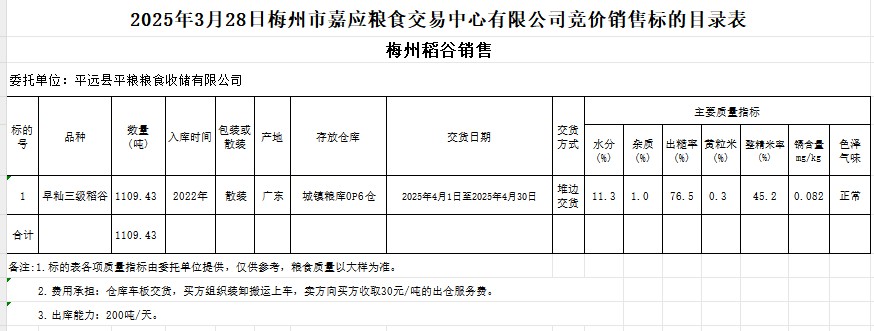 受客戶委托,梅州市嘉應(yīng)糧食交易中心有限公司定于2025年3月28日(星期五)舉辦糧食競價(jià)交易會。平遠(yuǎn)縣平糧糧食收儲有限公司擬銷售2022年產(chǎn)早秈稻1109.43噸。