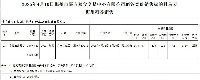 受客戶委托,梅州市嘉應(yīng)糧食交易中心有限公司定于2025年4月10日(星期四)舉辦糧食競價交易會。梅州市梅縣區(qū)穗豐糧食收儲有限公司擬銷售2022年產(chǎn)早秈稻谷2949.542噸。