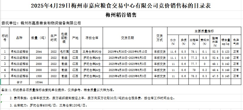 受客戶委托,梅州市嘉應(yīng)糧食交易中心有限公司定于2025年4月29日(星期二)舉辦糧食競(jìng)價(jià)交易會(huì)。梅州市嘉泰糧食和物資儲(chǔ)備有限公司擬銷售2022年產(chǎn)早秈稻谷10344噸。
