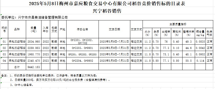 受客戶委托,梅州市嘉應(yīng)糧食交易中心有限公司定于2025年5月8日(星期四)舉辦糧食競價交易會。興寧市齊昌糧油儲備管理有限公司擬銷售2022年、2023年產(chǎn)早秈稻谷9442.183噸。