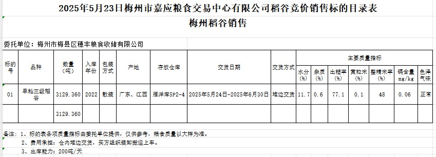 受客戶委托,梅州市嘉應(yīng)糧食交易中心有限公司定于2025年5月23日(星期五)舉辦糧食競價交易會。梅州市梅縣區(qū)穗豐糧食收儲有限公司擬銷售2022年產(chǎn)早秈稻谷3129.360噸。