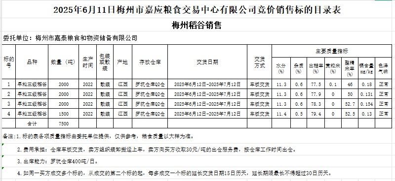 受客戶委托,梅州市嘉應(yīng)糧食交易中心有限公司定于2025年6月11日(星期三)舉辦糧食競(jìng)價(jià)交易會(huì)。梅州市嘉泰糧食和物資儲(chǔ)備有限公司擬銷售2022年產(chǎn)早秈稻谷7500噸。