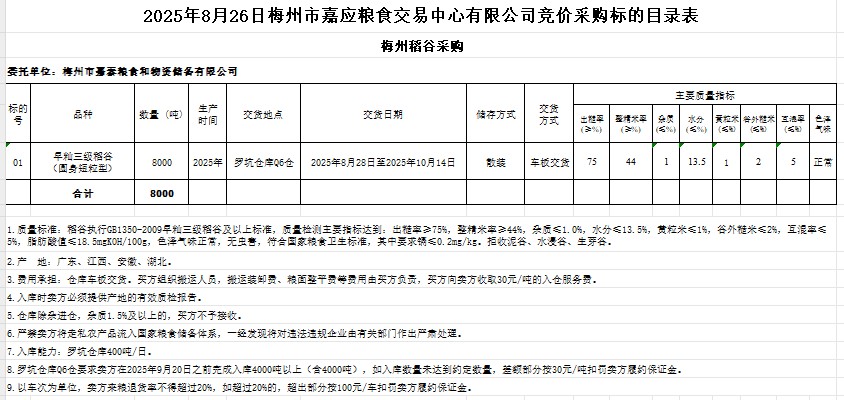 受客戶委托,梅州市嘉應(yīng)糧食交易中心有限公司定于2025年8月26日(星期二)舉辦糧食競價(jià)交易會(huì)。梅州市嘉泰糧食和物資儲(chǔ)備有限公司擬采購2025年產(chǎn)早秈稻谷8000噸。