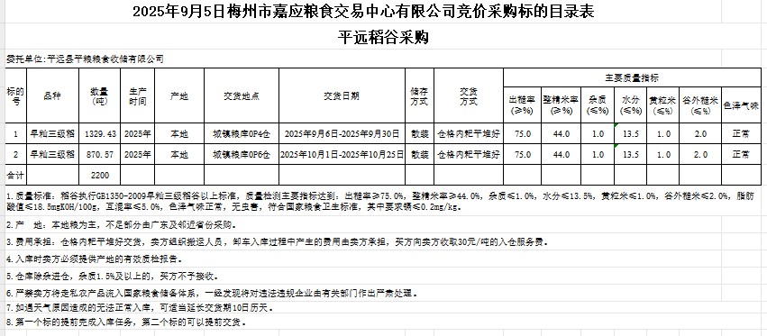 受客戶委托,梅州市嘉應糧食交易中心有限公司定于2025年9月5日(星期五)舉辦糧食競價交易會。平遠縣平糧糧食收儲有限公司擬采購2025年產(chǎn)早秈稻谷2200噸。