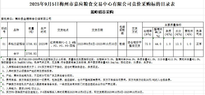 受客戶委托,梅州市嘉應(yīng)糧食交易中心有限公司定于2025年9月5日(星期五)舉辦糧食競(jìng)價(jià)交易會(huì)。蕉嶺縣金穗糧食收儲(chǔ)有限公司采購(gòu)2025年產(chǎn)早秈稻谷3706.93噸。