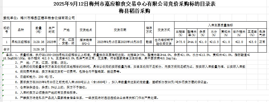 受客戶委托,梅州市嘉應(yīng)糧食交易中心有限公司定于2025年9月12日(星期五)舉辦糧食競價(jià)交易會(huì)。梅州市梅縣區(qū)穗豐糧食收儲(chǔ)有限公司擬采購2025年產(chǎn)早秈稻谷3129.36噸。