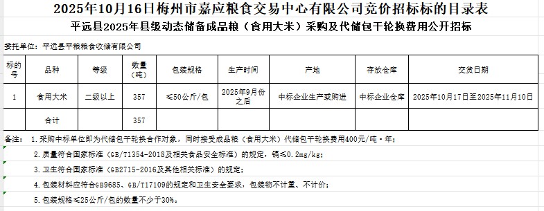 平遠(yuǎn)縣2025年縣級動態(tài)儲備成品糧(食用大米)采購及代儲包干輪換費(fèi)用公開招標(biāo)公告