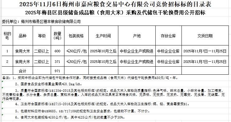 梅縣區(qū)2025年縣級儲備成品糧(食用大米)采購及代儲包干輪換費用公開招標(biāo)公告