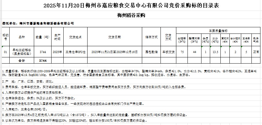 受客戶委托,梅州市嘉應(yīng)糧食交易中心有限公司定于2025年11月20日(星期四)舉辦糧食競價(jià)交易會。梅州市嘉泰糧食和物資儲備有限公司擬采購2025年產(chǎn)早秈稻谷3744噸。