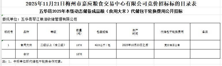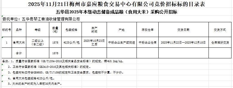 五華縣2025年本級動態(tài)儲備成品糧(食用大米)采購及代儲包干輪換費用公開招標公告