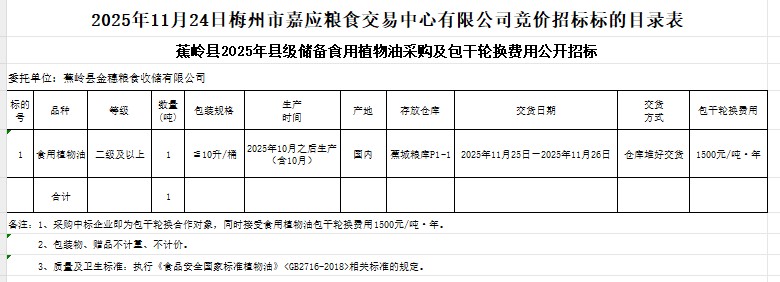 蕉嶺縣2025年縣級儲備食用植物油采購及包干輪換費(fèi)用公開招標(biāo)公告